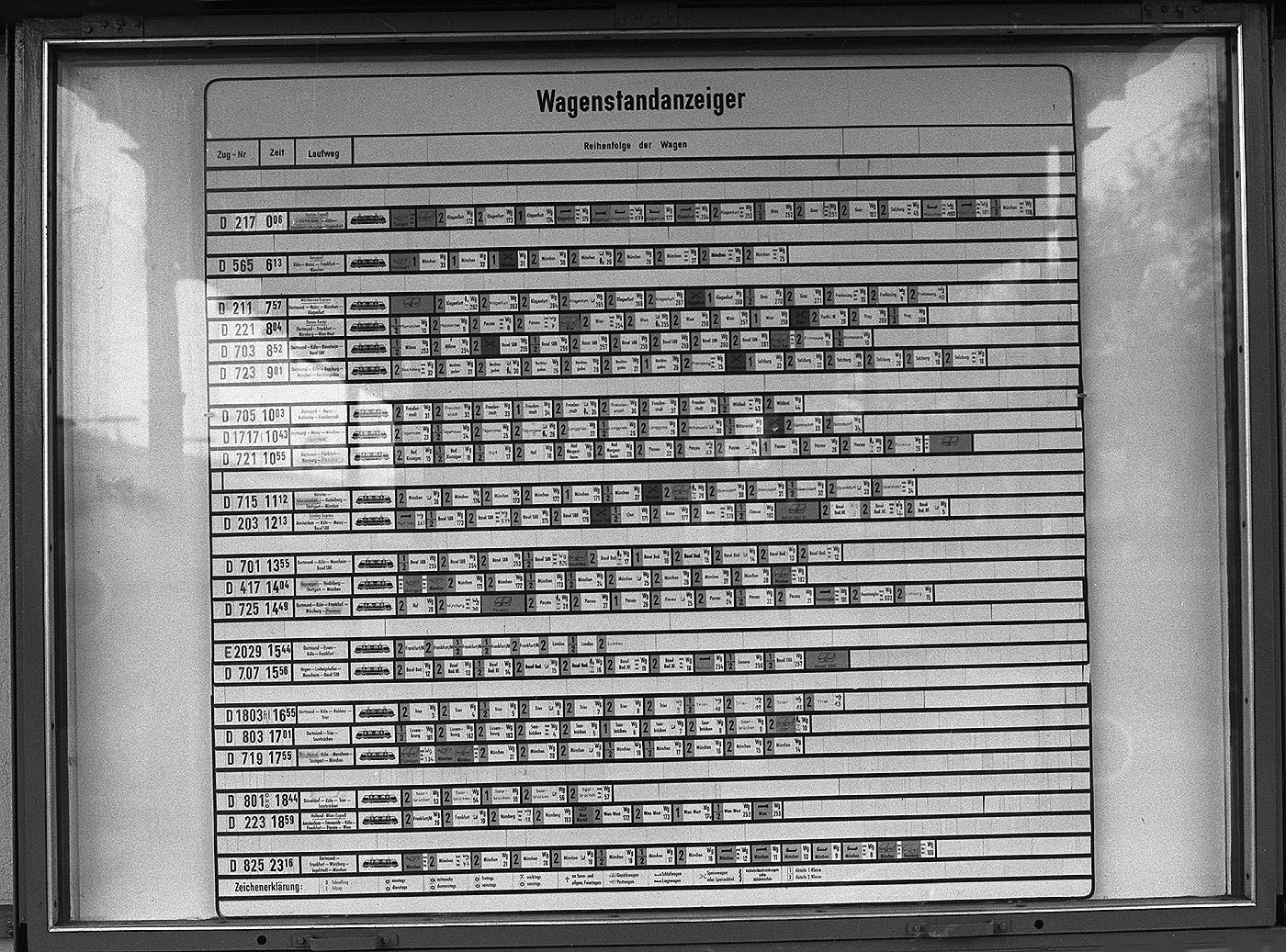 Ansicht des Wagenstandanzeigers auf Bahnsteig 2/3 am 25.12.1979.