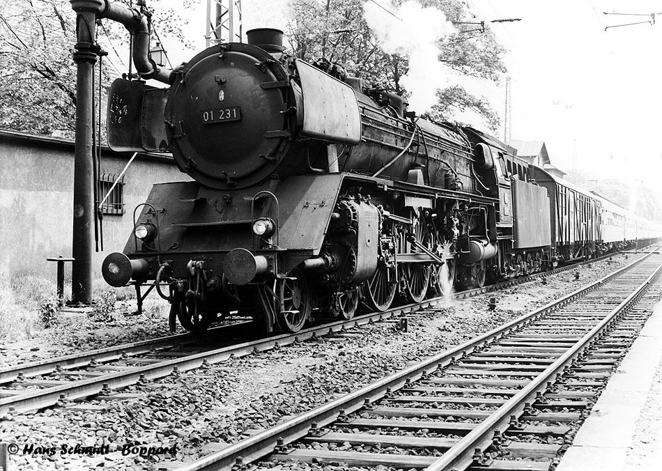 01 231 vom Bw Köln Bbf am 14.06.1958 um 12.07 Uhr mit D201 (Stuttgart - Köln) in Gleis 1.