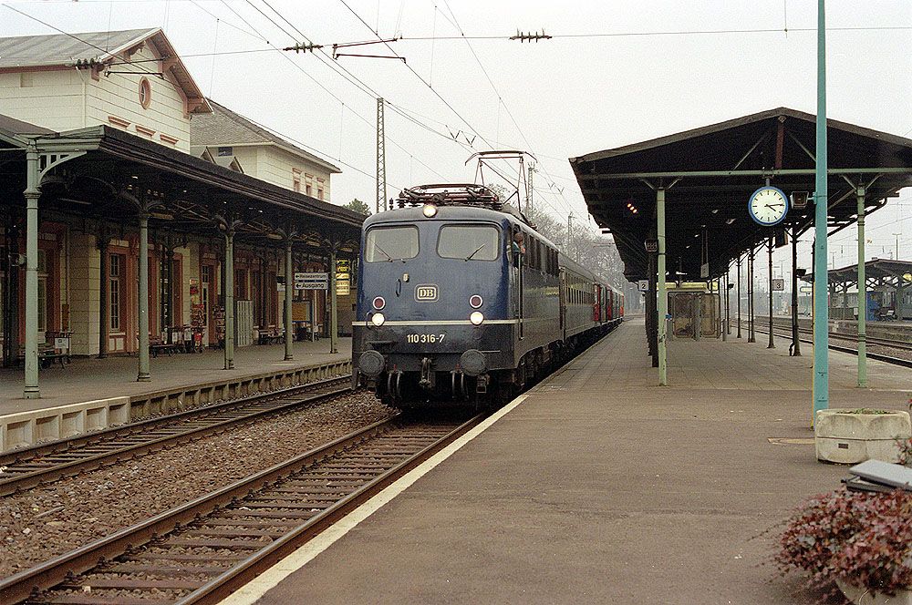 110 316 steht am 05.02.1993 mit N um 16.15 Uhr abfahrbereit nach Köln-Deutz am Bahnsteig.