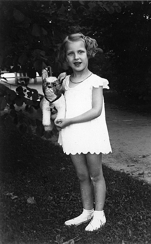 Dieses Mädchen hält in den Zwanzigern einen Stoffhund im Arm. Zu welcher Hunderasse gehört er wohl ?
