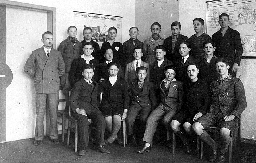 Die Berufsschulklasse der Motorenschlosser ist hier mit ihrem Lehrer zum Fototermin versammelt.