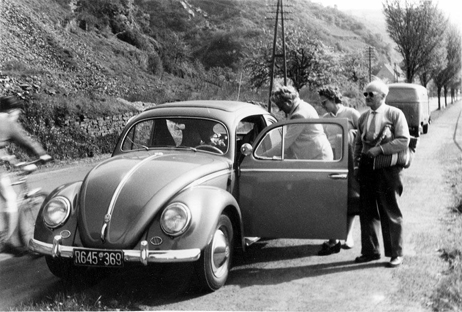 Die Rast ist beendet. Der VW Käfer mit ovalem Heckfenster und Stoffschiebedach wird die Familie