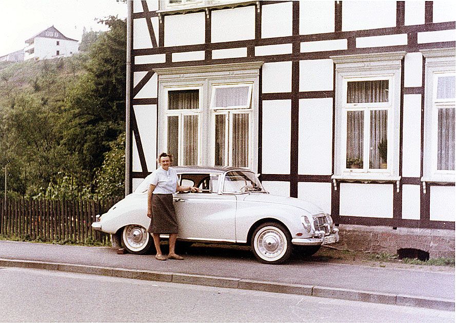 Tante Margret zeigt uns die neue "Familienkutsche", einen DKW Auto Union 1000 S mit gebogener Frontscheibe