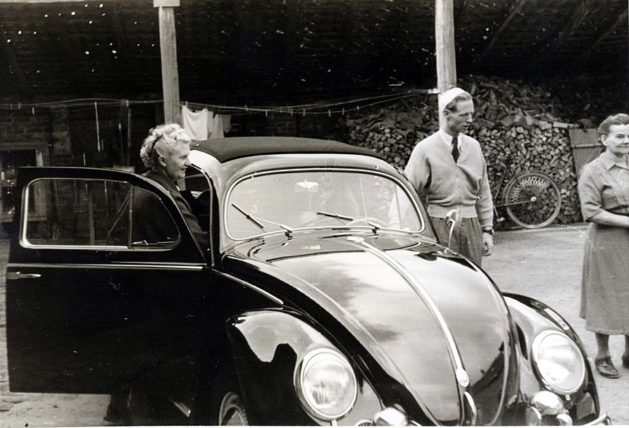 Die ganze Familie ist zur Begutachtung des neuen VW Käfers versammelt.