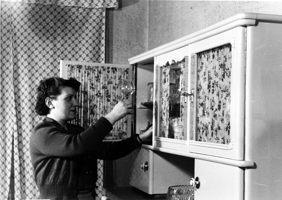 Ein Küchenschrank mit Scheibentüren und Gardinen stand in vielen Wohnungen.