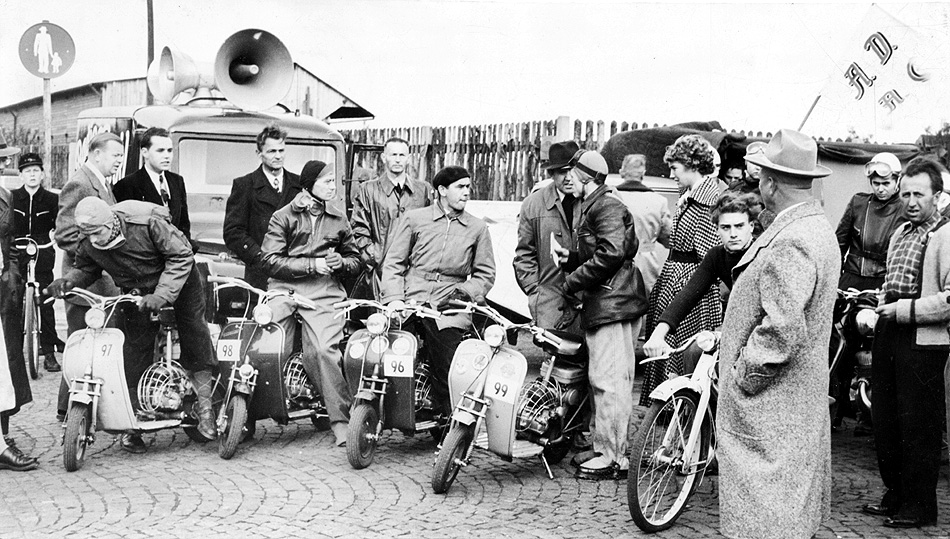 Fahrer mit Renn-Lambretta als Teilnehmer an der ADAC-Fahrt in Fürth 1953
