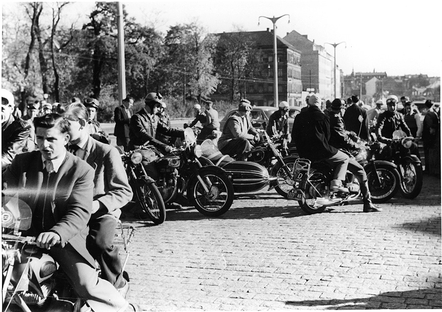 Der Tross der Teilnehmer an der ADAC-Fahrt in Fürth 1953 setzt sich in Bewegung