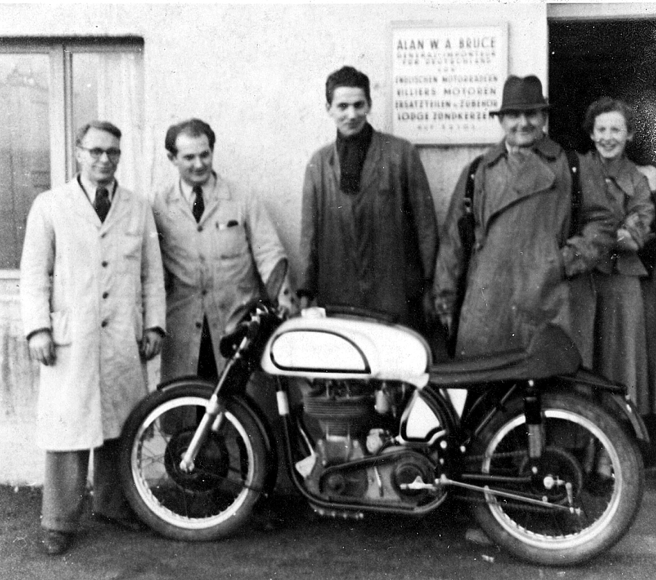 Inhaber und Techniker der Motorenwerkstatt präsentieren eine Norton-Rennmaschine