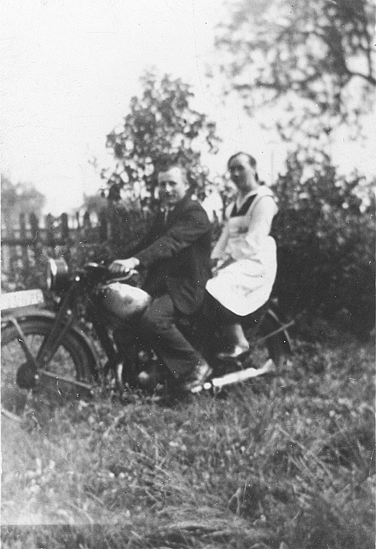 Auf dem Motorrad sitzend zeigen sich Vater und Tochter auf einem unscharfen Foto