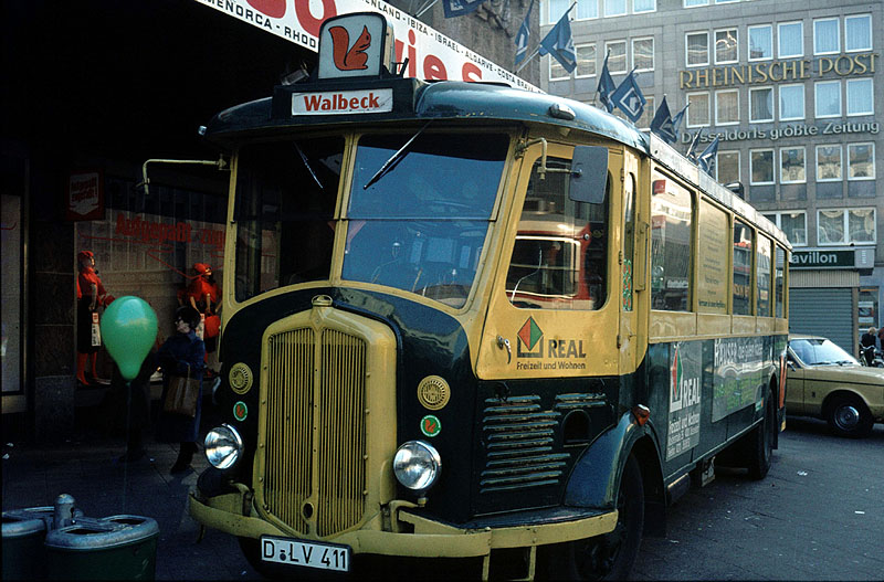 Französischer Omnibus in den Achtzigern zu Werbezwecken in Düsseldorf unterwegs