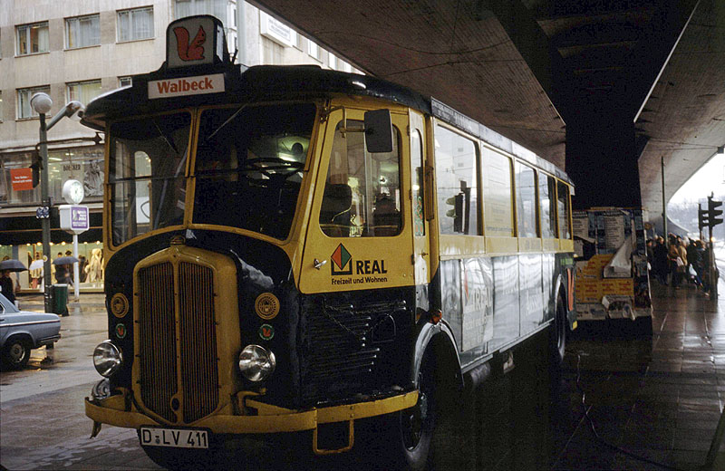 Französischer Omnibus in den Achtzigern zu Werbezwecken in Düsseldorf unterwegs