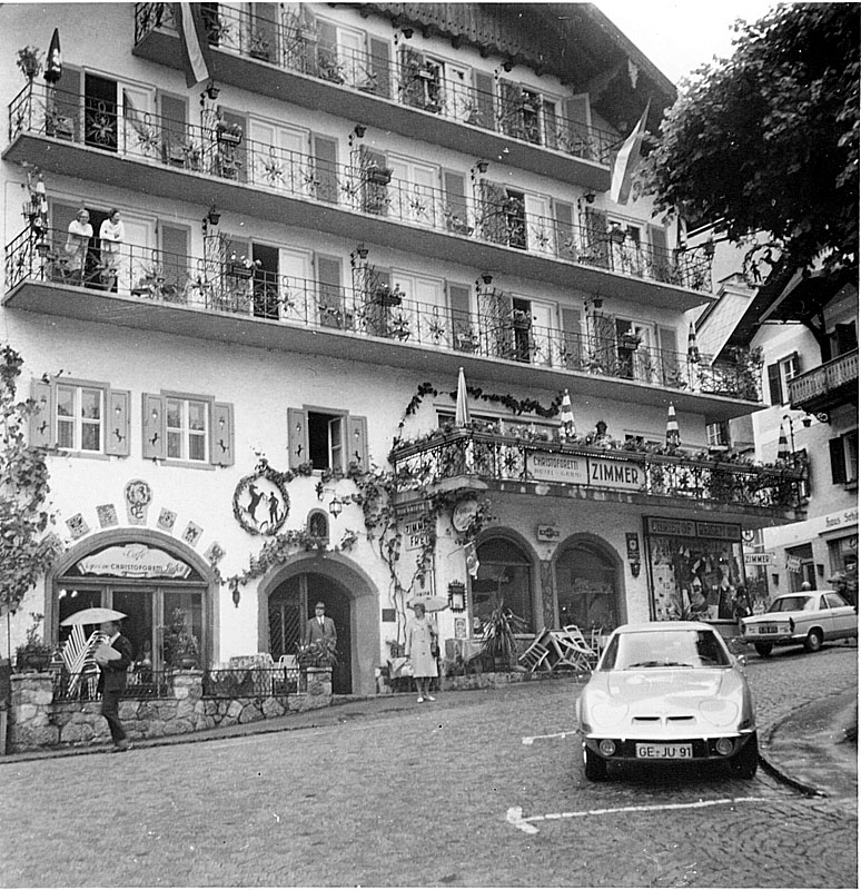 Vor dem Hotel Christoforetti in St. Wolfgang / Österreich stehen am 28.06.1969 ein Opel GT und ein BMW 700