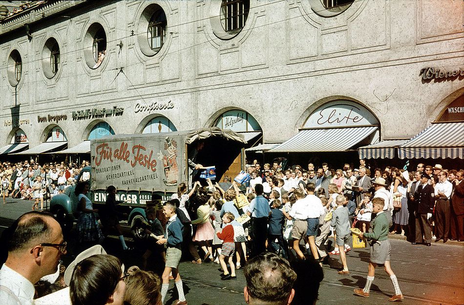 Kinder werden am Opel Blitz Pritschenwagen mit Papierfähnchen versorgt, um damit den Zugteilnehmern zuwinken zu können.