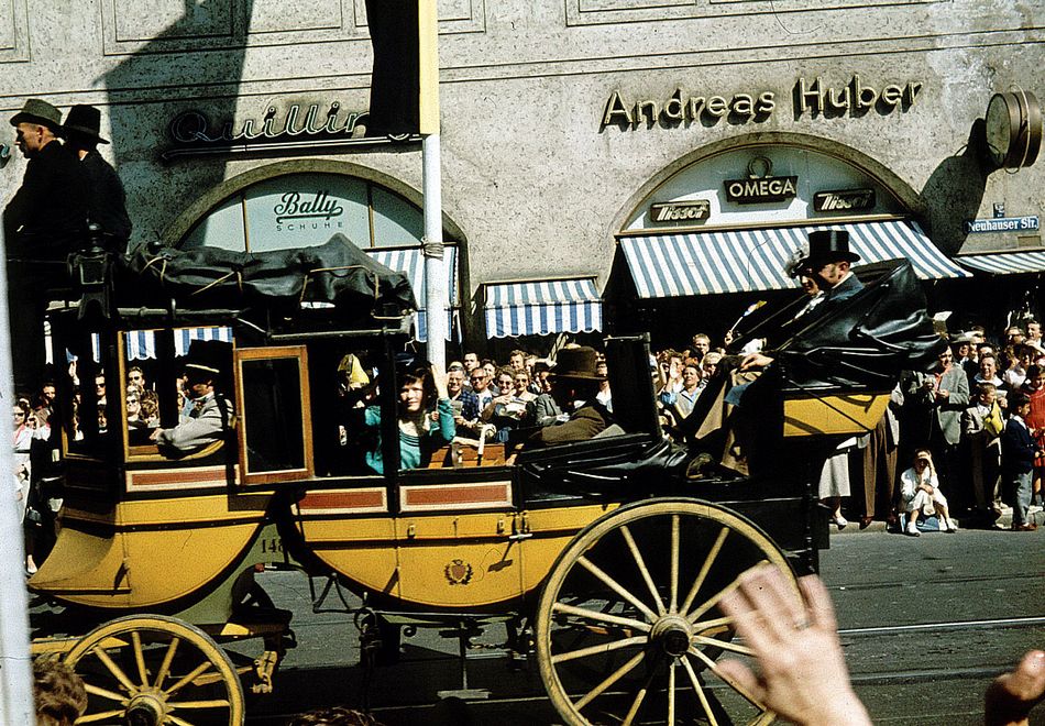 Mehrere Fahrgäste sehen uns aus einer offenen Postkutsche an.