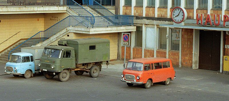 Der DB zugeordnete Fahrzeuge vor dem Magdeburger Hbf am 25.06.1992.