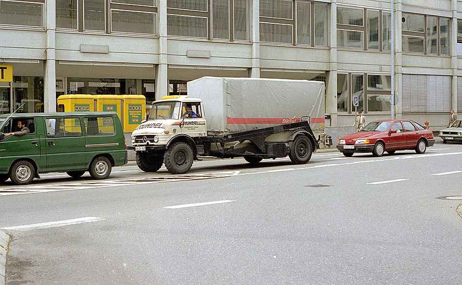 Mercedes-Unimog KN-EX 945 mit Hubaufbau in den Achtzigern aufgenommen in Singen.