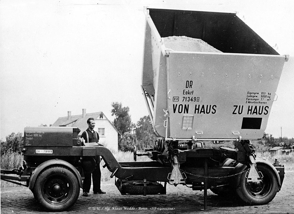 Einrichtung bekannt, die es gestattete, mittels Großbehälter Sendungen ohne umzuladen von Haus zu Haus zu befördern.