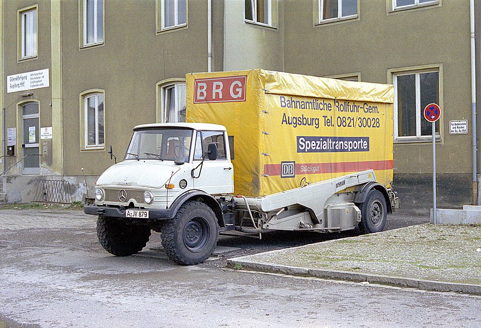 Mercedes-Unimog der Bahnamtlichen Rollfuhr Gem. (BRG) Augsburg in den Achtzigern in Augsburg.