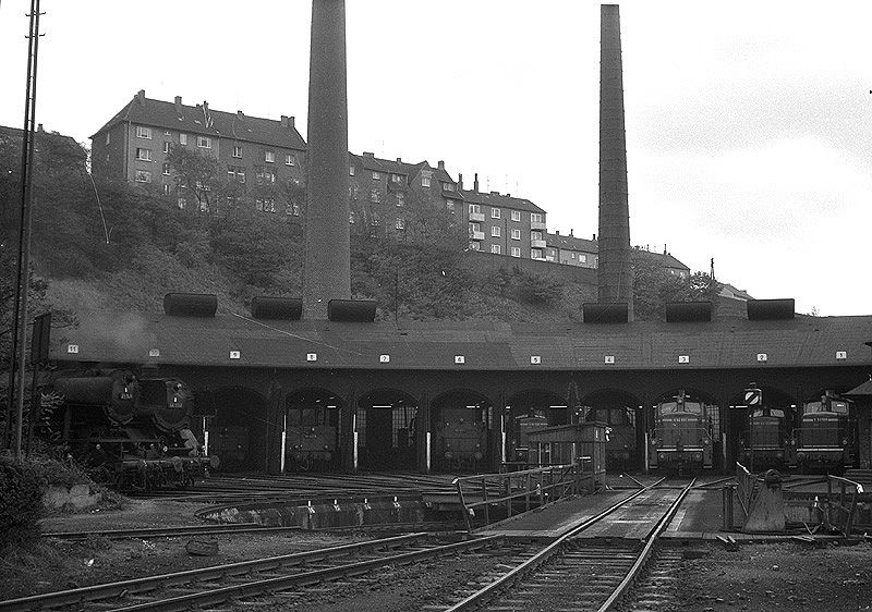 Bahnbetriebswerk Hagen Gbf am 22.10.1967 mit Dampfloks der BR 23 und 44.