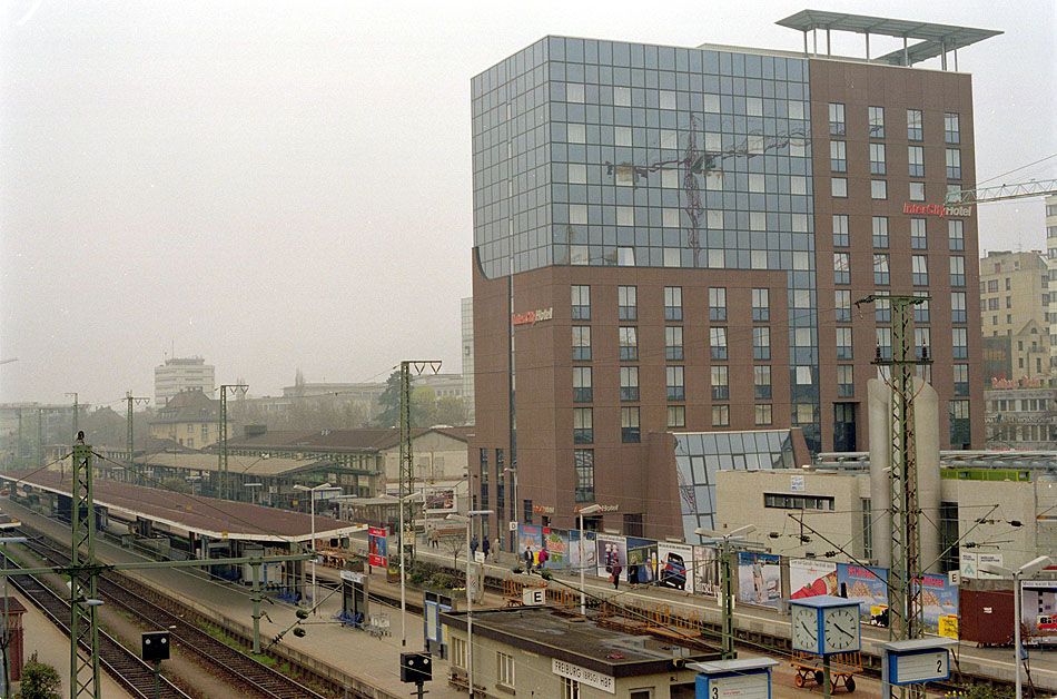 Blick von der Stadtbrücke auf die InterCityHotel-Baustelle in Freiburg Hbf am 13.04.1993