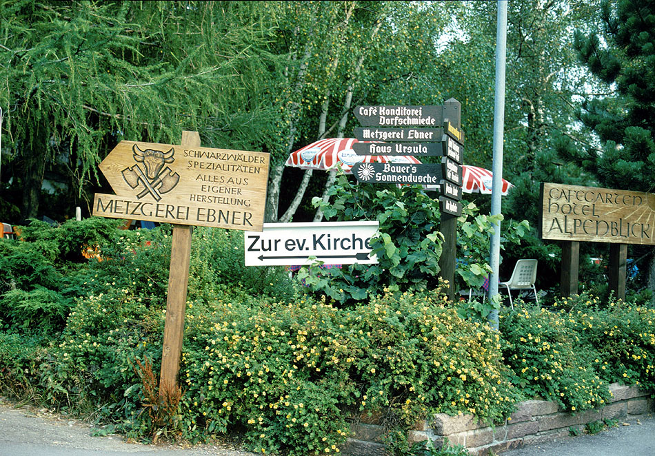Am Cafégarten des Hotel Alpenblick weisen diese Schilder in den Hebelweg.