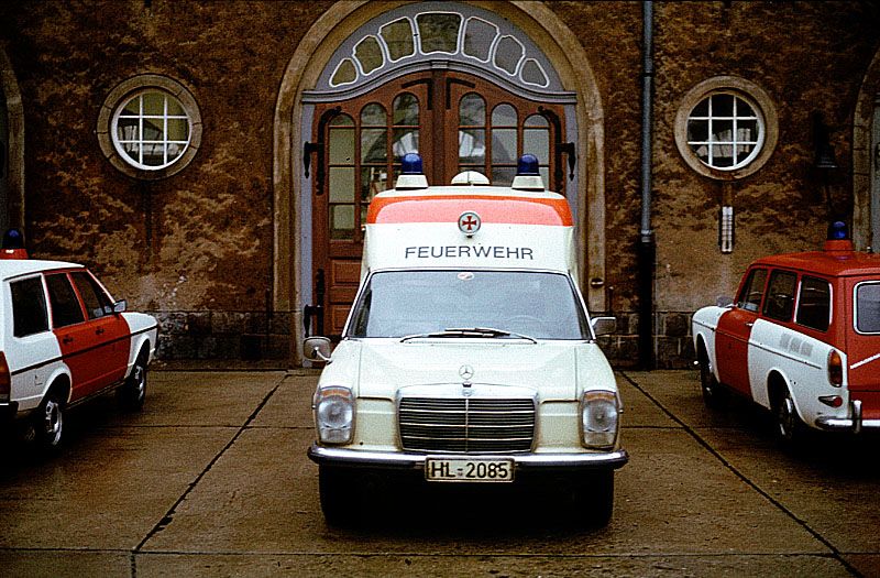 Mercedes-Benz W115-Typ/8 - Krankentransportwagen zwischen VW-Passat und VW 1600 Variant.