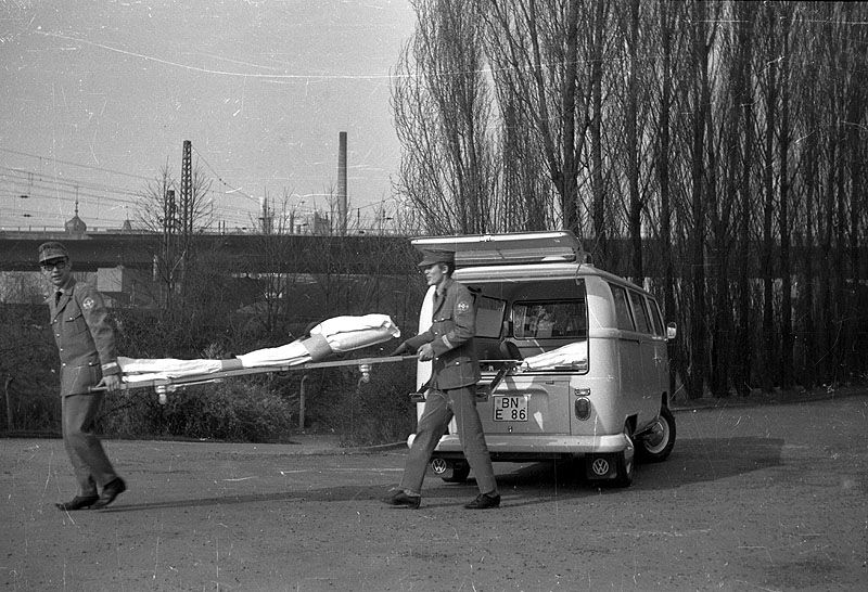 die Trage wird aus dem VW-KTW Typ T2a mit dem Kennzeichen BN-E86 geholt.