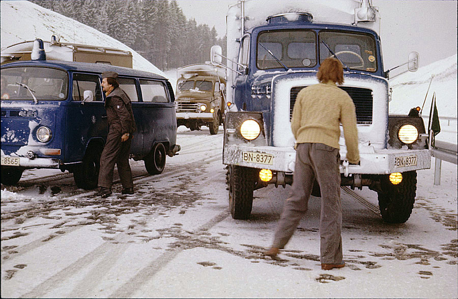Einige nutzen die Fahrtpause für eine Schneeballschlacht. Aus heutiger Sicht