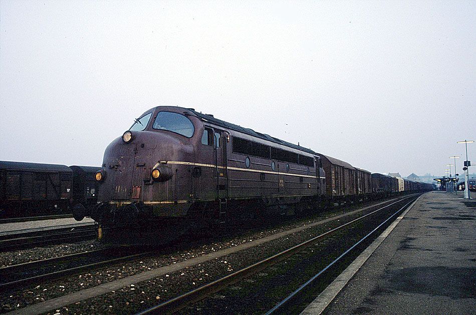 DSB-Diesellok des Typs My mit einem Güterzug am 03.04.1982 in Naestved / Dänemark