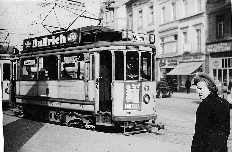 Zug 43 wartet 1952 an der Haltestelle Friedensplatz auf die Weiterfahrt nach Endenich