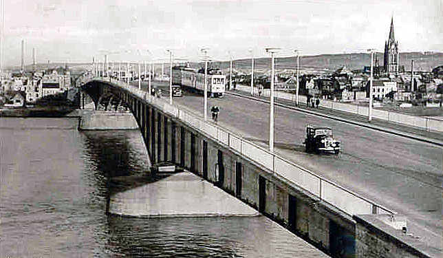 Ein Zug der Linie H oder S überquert in den Fünfzigern die Rheinbrücke von Beuel kommend
