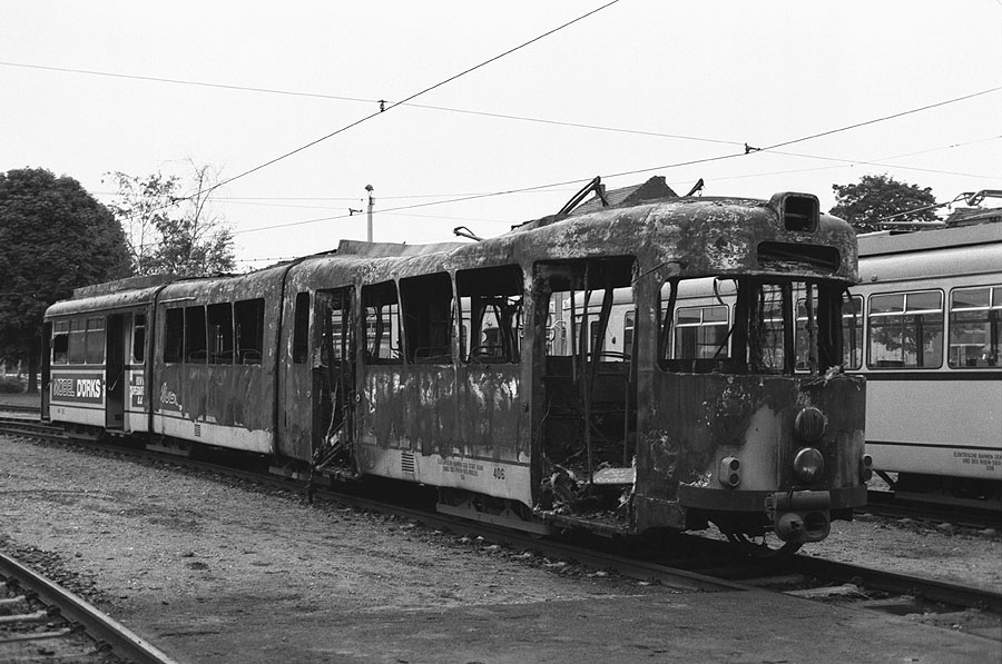 Im Depot Bonn-Beuel steht am 03.10.1981 der ausgebrannte Zug 406