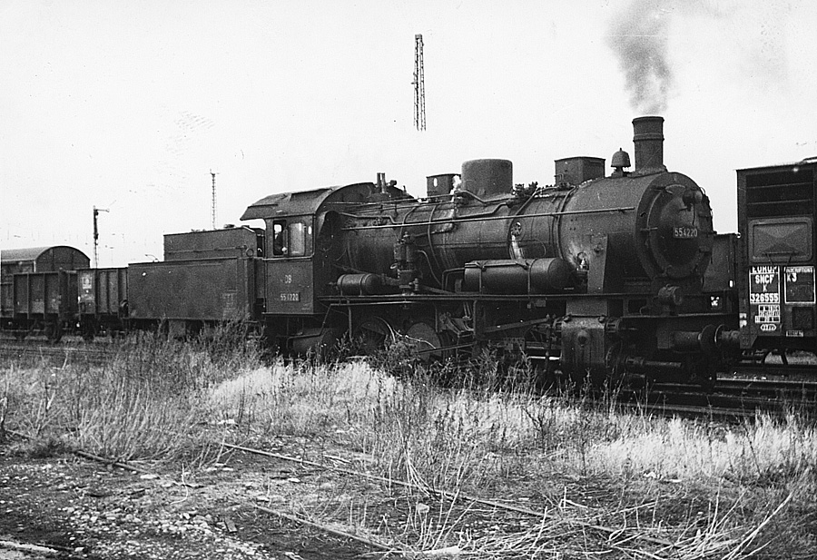 55 4220 des Bw Köln-Eifeltor steht im Februar 1966 im Gbf Bonn wegen Kleinlokausfall im Rangierdienst (Kettenschaden an Köf).