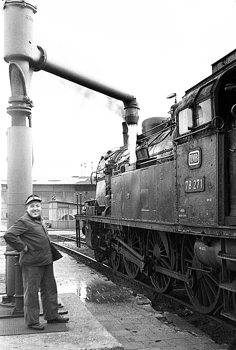 Lok 78 271 (Bw Euskirchen) hat im März 1966 den Wasserkran im ehemaligen Bw Bonn erreicht.