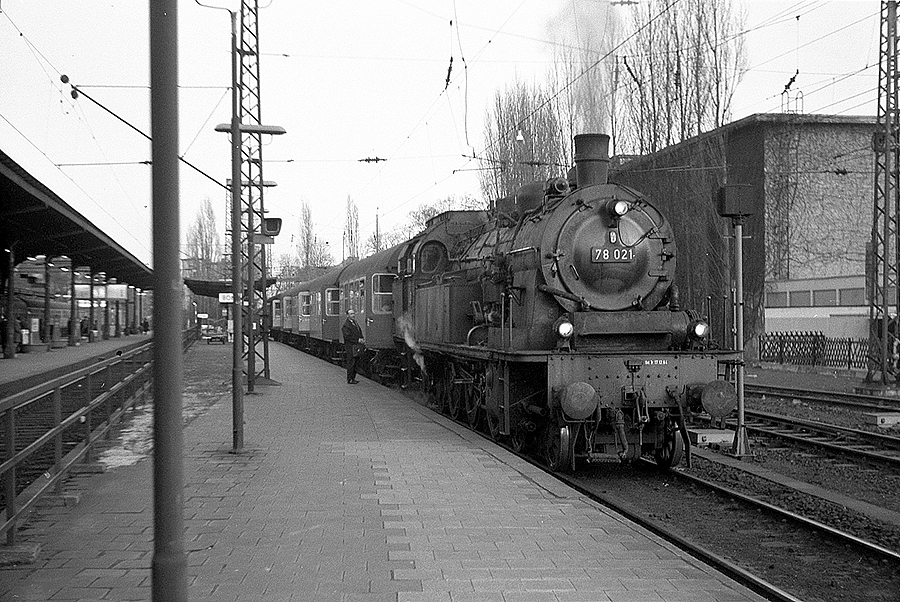 78 021 steht am 10.03.1967 mit dem Personenzug Bonn - Euskirchen abfahrbereit in Bonn Hbf.