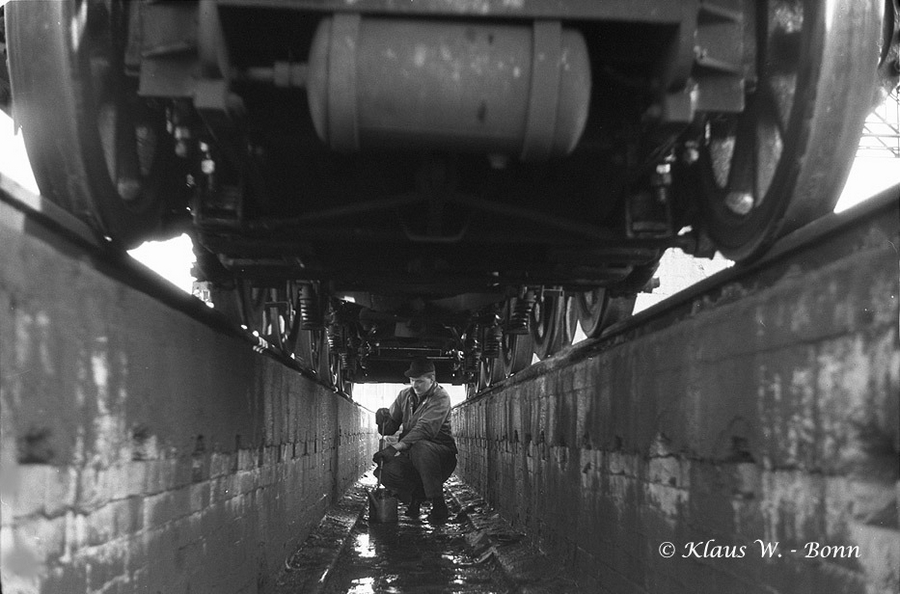 Bw Bonn. Das Bild zeigt den Heizer unter der Lok beim Abschmieren. Die Lok war als Ersatz für eine