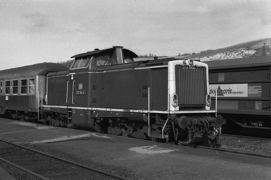 212 044 steht am 14.04.1984 abfahrbereit nach Ahrweiler am Bahnsteig in Bad Neuenahr.