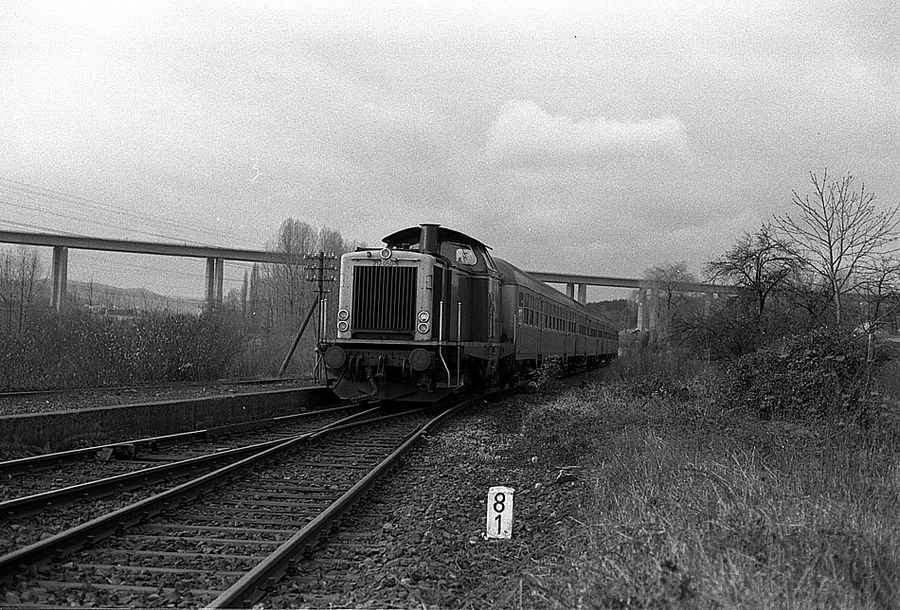An Kilometerstein 8,1 vorbei fährt 212 050 am 07.12.1985 in Richtung Bad Neuenahr.