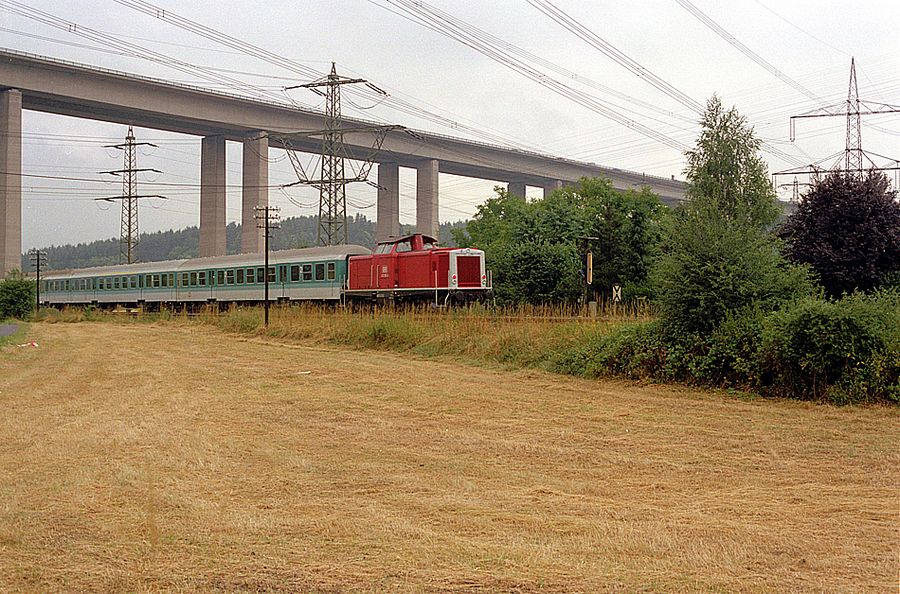 213 335 rollt am 06.07.1993 mit dem Wendezug unter der Ahrtalbrücke hindurch und weiter nach Kreuzberg/Ahr.