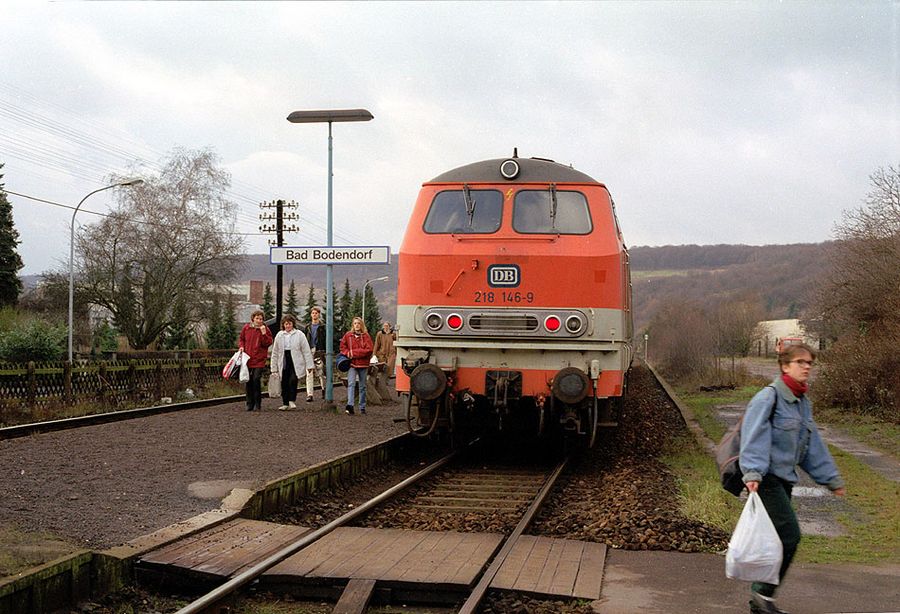 Am 12.12.1992 hat die Hagener City-Bahn-Lok 218 146 mit einem Regionalbahnzug Bad Bodendorf erreicht.