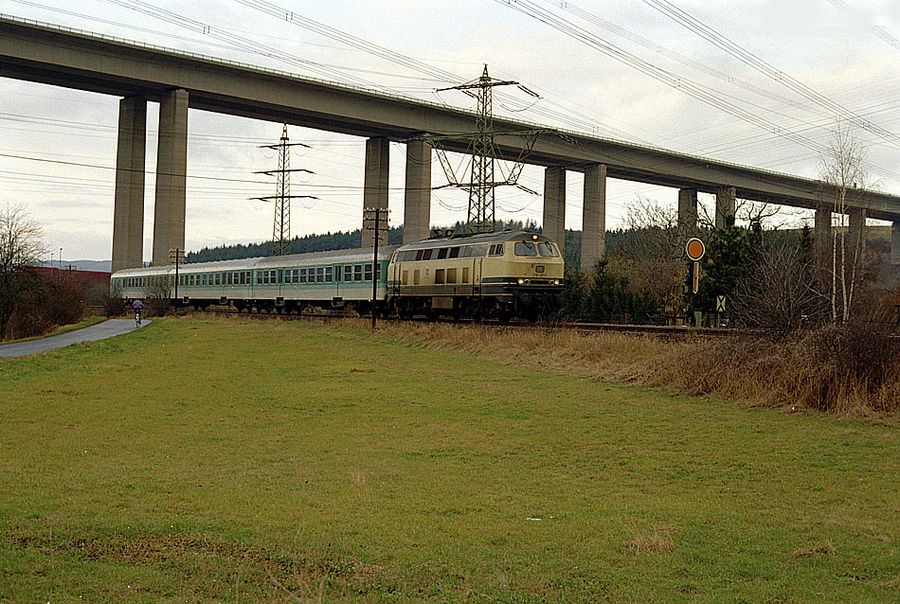 218 131 (Bw Hagen 1) ist am 16.01.1993 als Regionalbahn auf dem Weg nach Remagen.