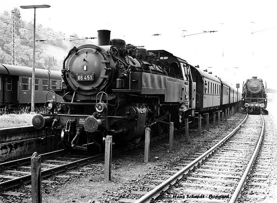86 451 vom Bw Kreuzberg am 14.06.1958 um 14.38 Uhr abfahrbereit mit einem Personenzug (Remagen - Adenau) in Gleis 4.