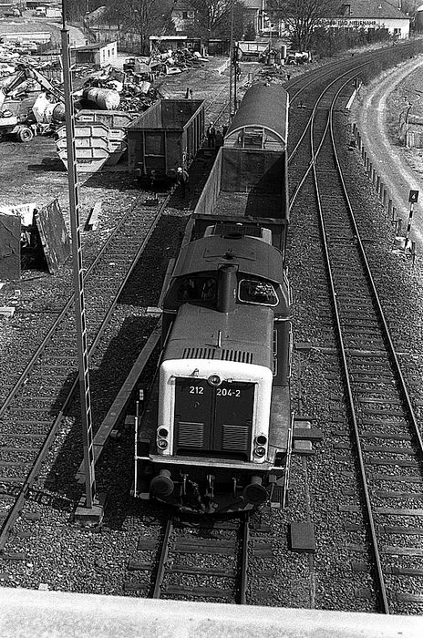 Der angeforderte Hilfszug mit der Zuglok 212 204 ist am 14.04.1984 mit einem Ersatzgüterwagen