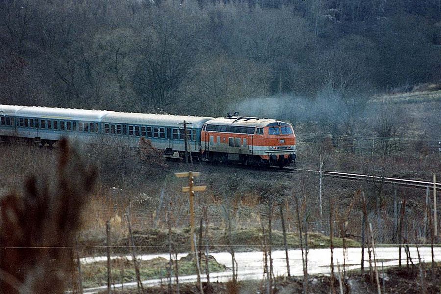 Welch seltener Gast. Die Hagener City Bahn-Lok schiebt einen Wendezug durch Mayschoß.