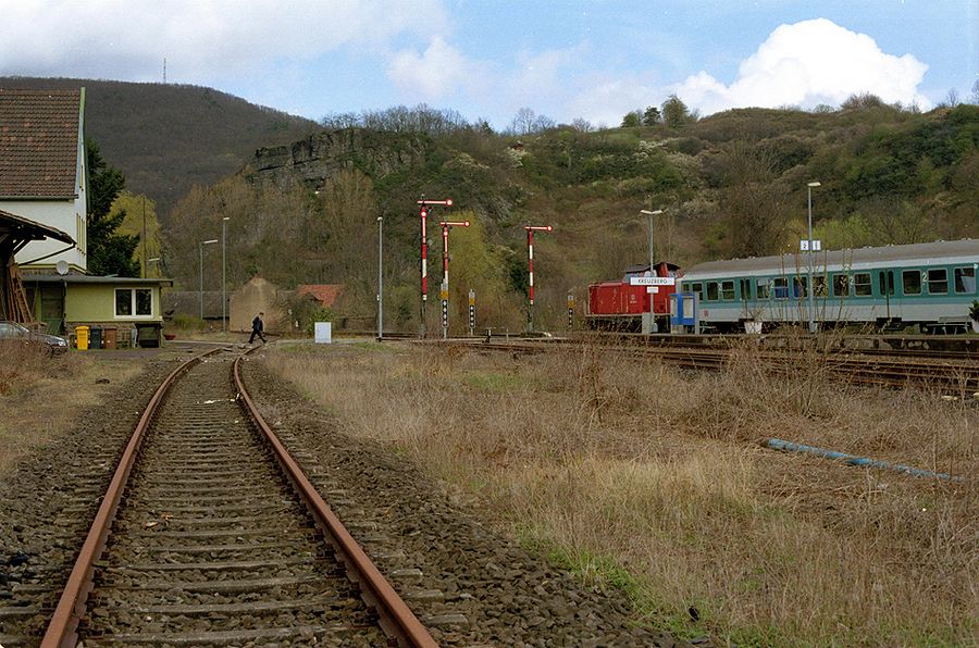 Der Zugführer geht vom Fahrdienstleiterbüro zum abfahrbereiten Zug.