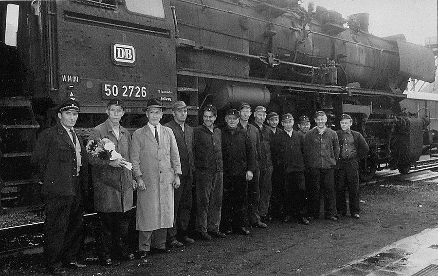 Die Bediensteten des Bw Kreuzberg/Ahr haben sich 1961 zu einem Gruppenbild vor der Ehranger Lok der Baureihe 50 aufgestellt.