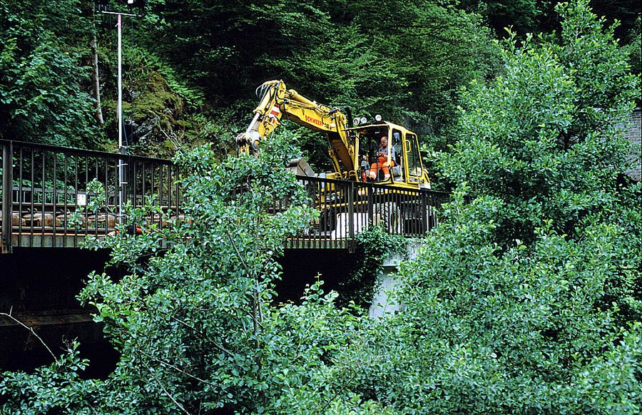 Im Juli 2005 sind bei den Gleisbauarbeiten zwischen Mayschoß und Rech etliche Gleisbagger im Einsatz.