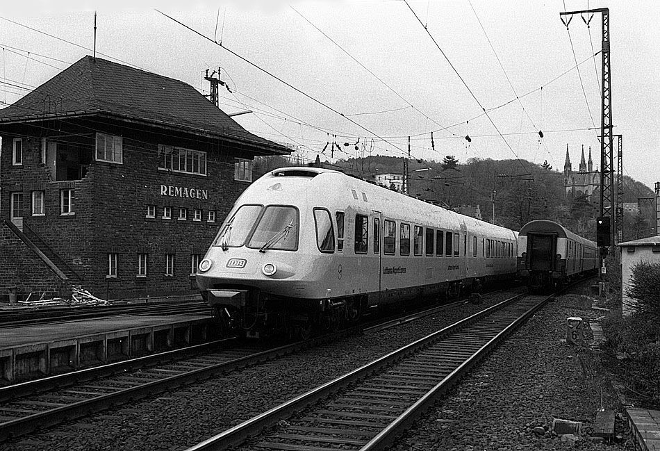 403 006 vom Bw Hamm passiert am 11.04.1982 als Lufthansa-Airport-Express -LH1005- von Bonn kommend das im Abriss befindliche Stellwerk Remagen West (Rw).