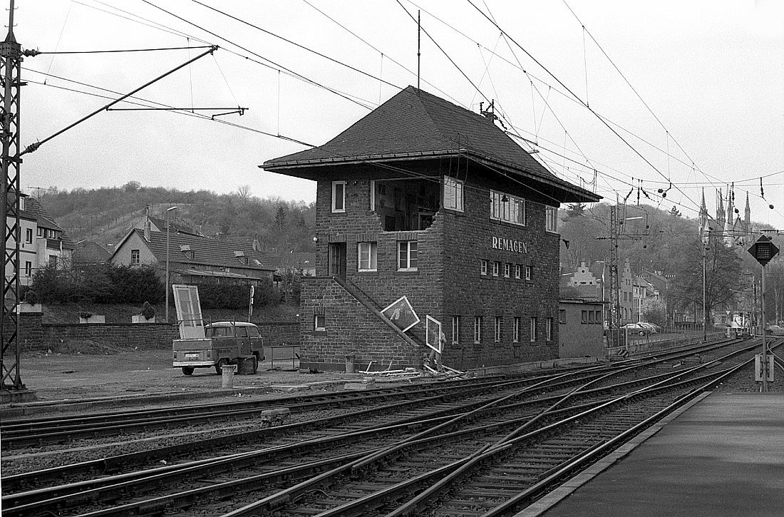 Das im Abriss befindliche Stellwerk Remagen West (Rw), das Ende der 1930er Jahre erbaut wurde, hat am 10.04.1982 dieses Aussehen.