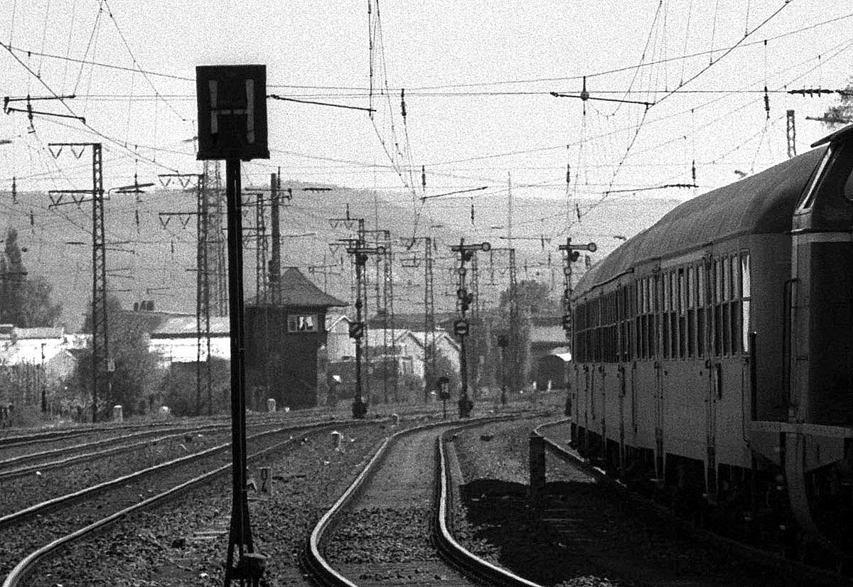 Das Stellwerk Remagen Ost ist am 11.05.1980 in der Ferne erkennbar.